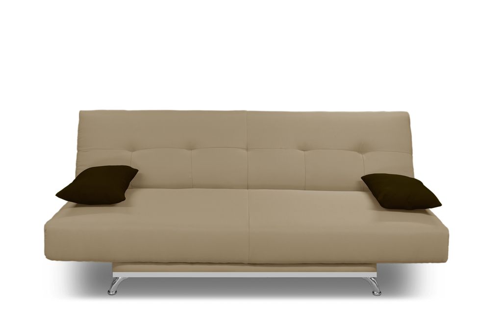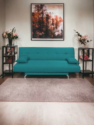 Небольшой мягкий диван из высокоэластичного пенополиуретана с пружиной змейка, каркас которого состоит из бруса хвойных пород с механизмом книжка и декором из двух подушек представлен в нашем выставочном зале.