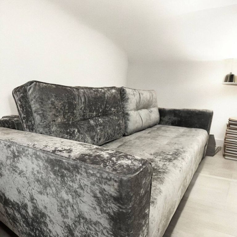 Современный диван - кровать Киви - 7 с кантом на подлокотниках, подушках и простроченным тканевым полотном на сиденье идеальное дополнит интерьер вашей квартиры.